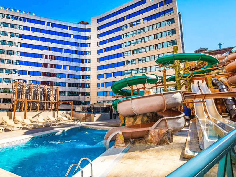 4* hotel in Salou with splash park with slides, family rooms and treehouse themed outdoor playground.