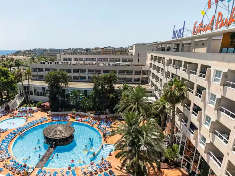 4* hotel in Salou with splash park with slides, family rooms and treehouse themed outdoor playground.