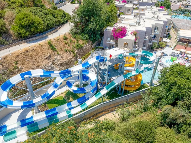 Great value 3* hotel with waterpark with 5 slides, splash park, all inclusive and 1 bedroom apartments. Near the beach.