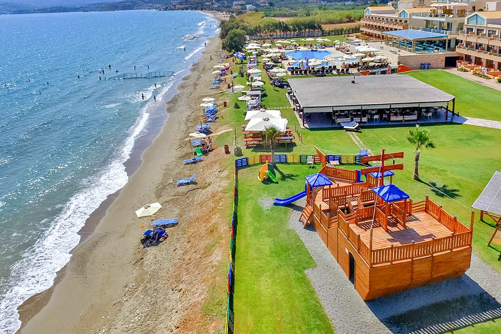 TheΒ Fodele Beach and Waterpark Holiday Resort is a modern All Inclusive resort in the little town of Fodele.Β Itβs perched on a hillside with far reaching countryside views whilst also being close to a small secluded beach. There are fantastic facilities for babies and toddlers at this hotel including a waterpark, 2 swimming pools with kids areas, a playground and a mini disco. There is also a great range of Family rooms which sleep up to 4 people. All Inclusive is available.
