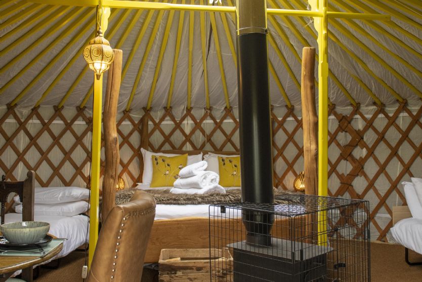 Goldfinch Yurt offers a luxurious family break in Wensleydale in the Yorkshire Dales. Inside the yurt, guests will find a four-poster bed and two foldable single beds, basic kitchen amenities, a bespoke bathroom with a rainfall shower and a flushing WC. Highchairs and travel cots are available upon request, catering for the needs of families with young children. The wood-burning stove adds a cosy ambience in the evenings. Additionally, an Indian fire bowl outside allows guests to cook al fresco on a grill. For families who prefer a hassle-free dining experience, the owners offer the option to order delicious homemade food, including breakfast, lunch, and dinner, as well as snacks and drinks. Breakfast, included in the price, is brought directly to the yurt each morning. A highlight of the Goldfinch Yurt is the private hot tub, allowing guests to relax and unwind while enjoying the beautiful surroundings. Guests also have access to Cherish Spa during their stay.
