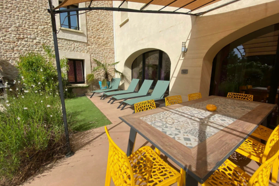 Flamant Rose is a stunning 4 bedroom villa sleeping up to 2 adults and 3 children. It’s a renovated Catalan stone villa with 2 huge glass entrance arches leading into the large kitchen-diner with a modern fully equipped kitchen and a beautiful rosewood dining table for family meals.