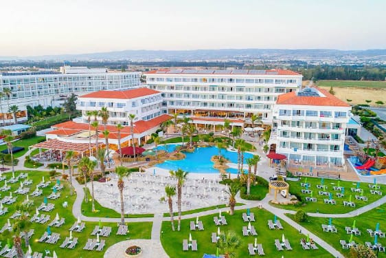 The Leornardo Cypria Bay & Aphrodite Waterpark is a beachfront hotel in Cyprus with a gorgeous swimming pool, modern family rooms, all inclusive and a playground. Little ones will love the pirate ship themed splash zone which has some mini waterslides and sprinklers. Paphos is just over 2km away.