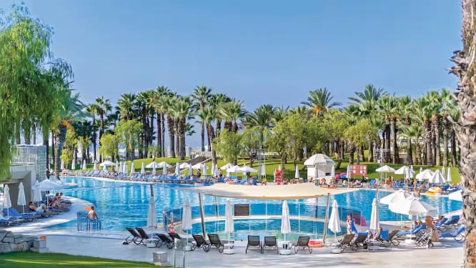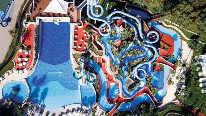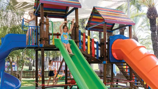 This resort is brimming with fun activities; first up, there are five swimming pools to explore, and then there is an exciting aqua park with racing slides. Family favourites include a games room, mini-golf, and a playground.