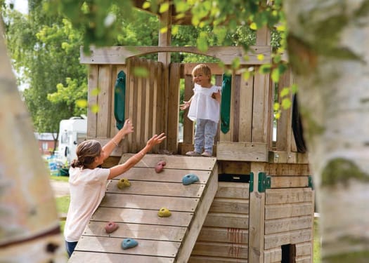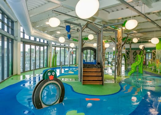 Lakeside holiday park with indoor swimming pool, outdoor playground and splash zone with water play.