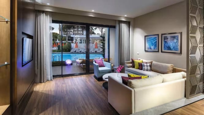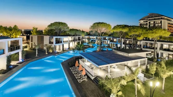 The Trendy Lara is a popular 5* all inclusive hotel in Antalya with 6 waterslides and a splash park with mini waterslides and tipping buckets. Antalya Beach is just outside the hotel, but families can also hop on the free shuttle bus to a private beach, which is only 3 mins away. The excellence entertainment at the Trendy Lara hotel includes professional shows, live bands and of course, the mini disco!